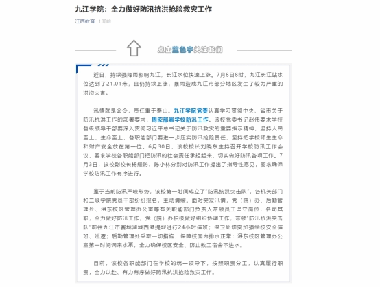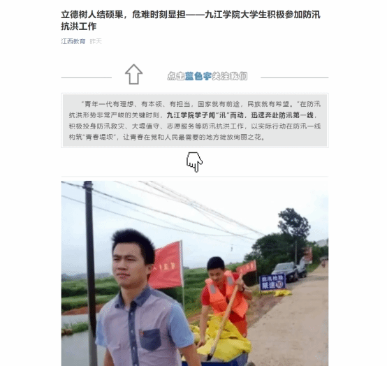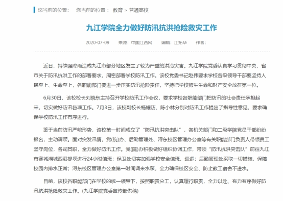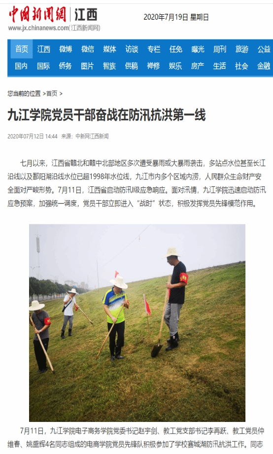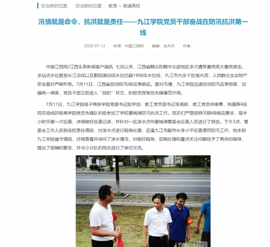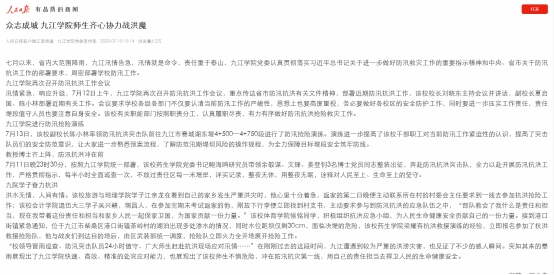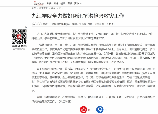 7月9日—7月18日,人民日报客户端、中国教育电视台、中国新闻网、学习强国、中国江西网、江西教育、江西教育电视台、江西省教育厅官方微信等主流媒体,分别以《众志成城 九江学院师生齐心协力战洪魔》《九江学院:全力做好防汛抗洪抢险救灾活动》《九江学院党员干部奋战在防汛抗洪第一线》《立德树人结硕果,危难时刻显担当——九江学院大学生积极参加防汛抗洪工作》为题,先后报道我校师生坚持“人民至上,生命至上”冲在防汛灾情第一线的事迹。