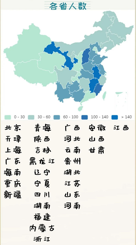 九江学院在全国30个省市自治区招生,其中安徽、山西、甘肃和江西四个省份的新生人数超过100人。