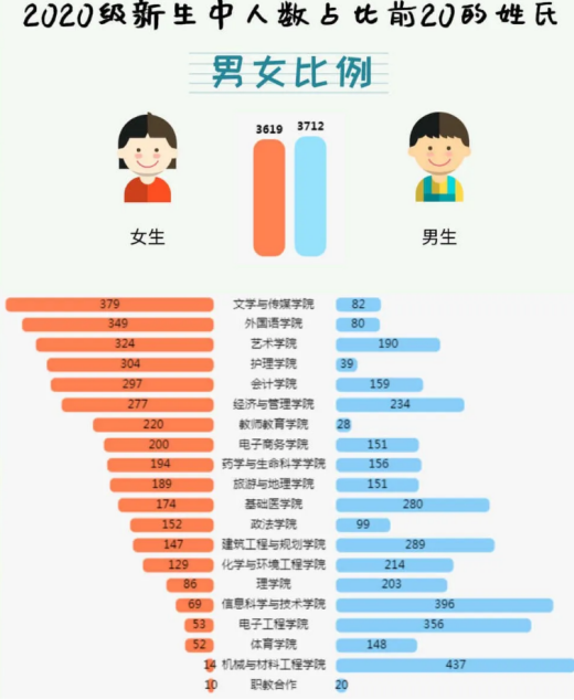 2020年录取的新生中,女生有3619人,男生有3712人。其中教师教育学院女生比例最高,约为88.71%;机械与材料工程学院男生比例最高,约为96.9%。