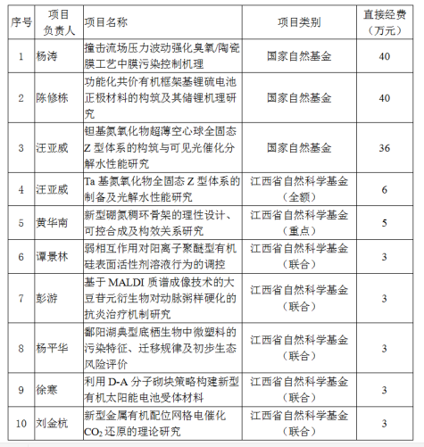 近日,国家自然科学基金委公布了2020年度国家自然科学基金申请项目评审结果,我校化学化工学院获批国家自然科学基金项目3项,获批直接经费共计116万元。此前,江西省科技厅、江西省自然科学基金委公布了2020年度江西省自然科学基金项目立项结果,化学化工学院获批江西省自然科学基金项目7项,其中重点资助1项。