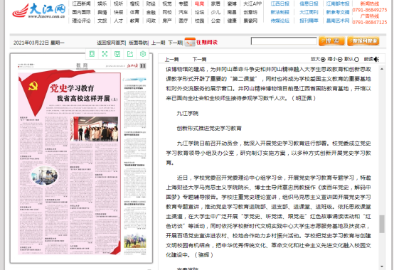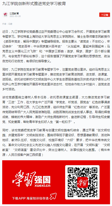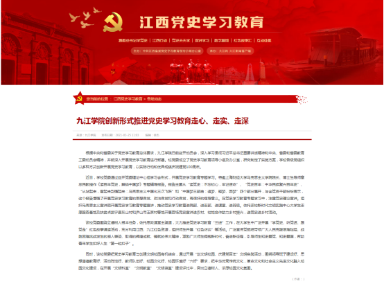 近日以来,学校党史学习教育受到中央及省市主要媒体广泛关注。截至目前,学习强国、人民日报客户端、新华社客户端、中国新闻网、江西省委党史教育专题网站、江西教育电视台、中国江西网、江西日报、江西教育网、九江广播电视台等媒体40余篇稿件报道了我校党史学习教育,引发校内外热烈反响,为党史学习教育的深入开展营造了良好的舆论氛围。