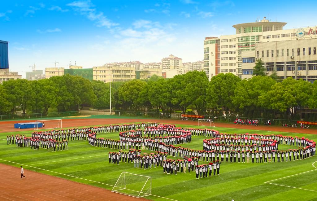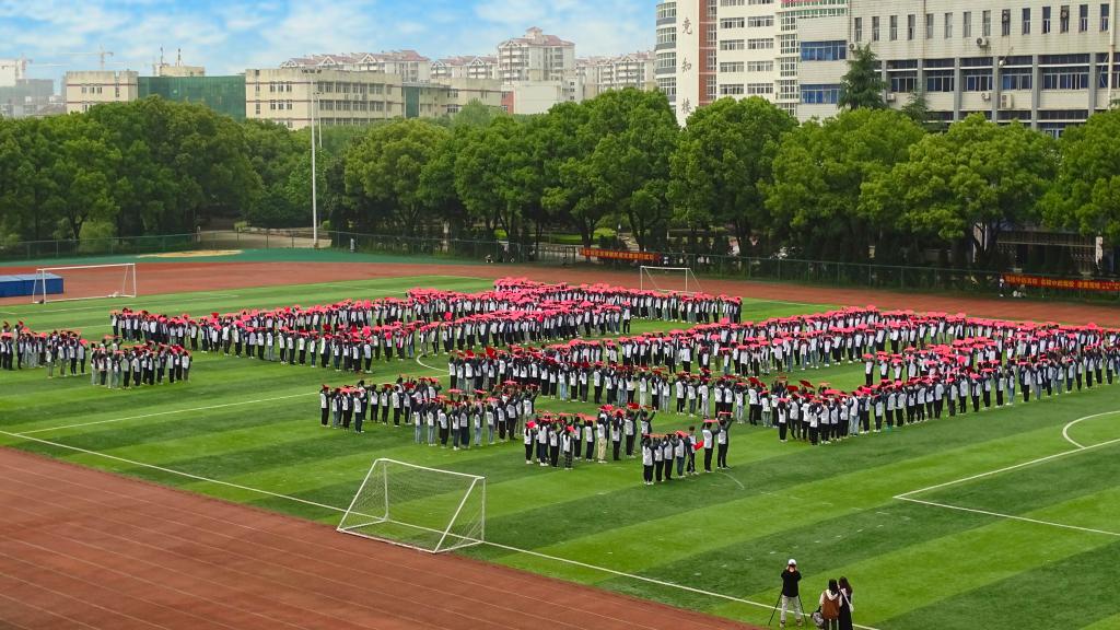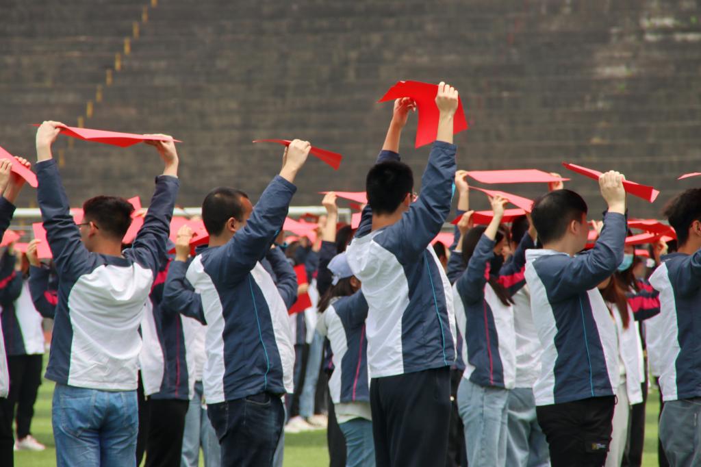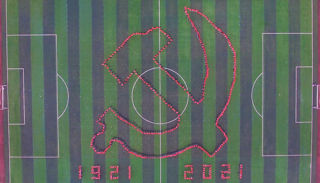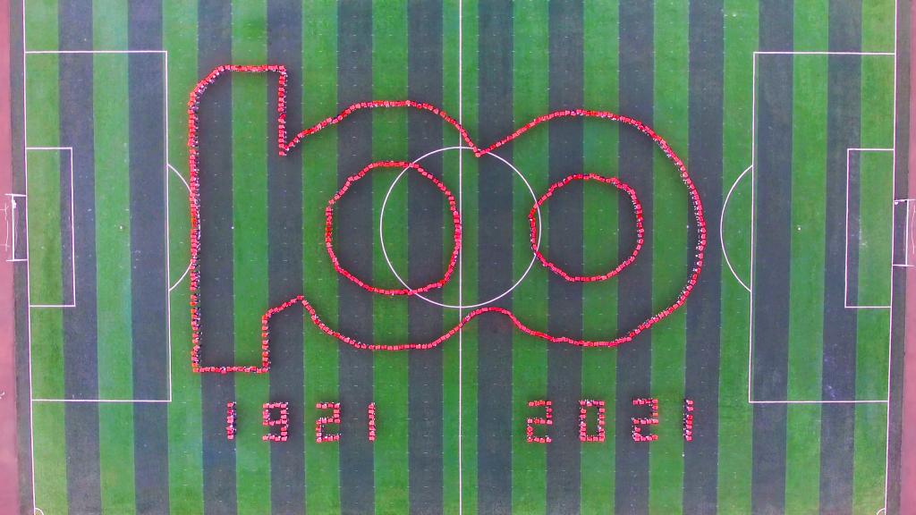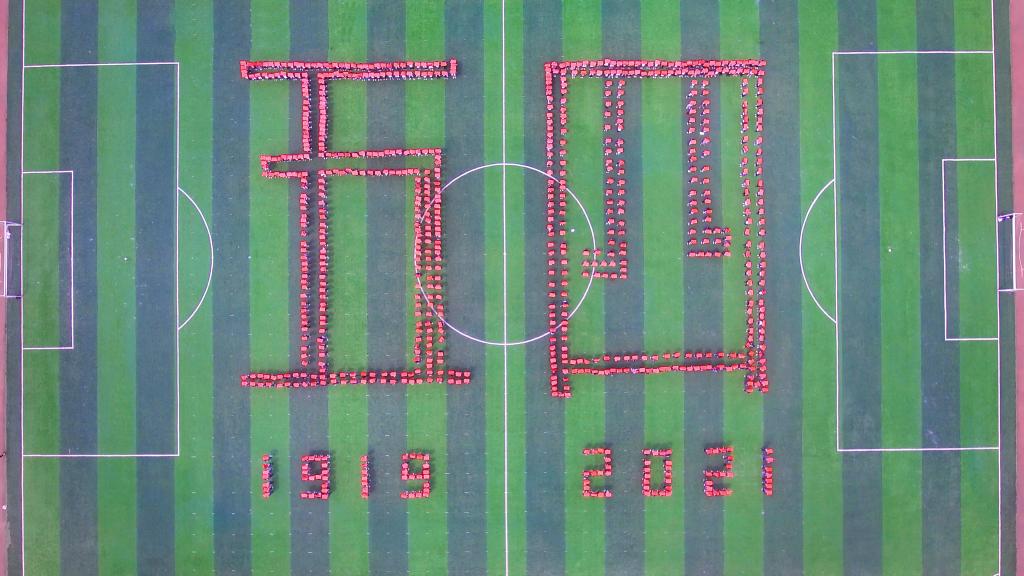 “五四”青年节前夕,校团委、校学生会举办了一次别开生面的“青春心向党”主题团日活动,800多名青年学生满怀喜悦、激动的心情在田径场内摆出巨型党徽和“五四”、“100”“1921-2021”、“1919-2021”等图案,以青春的方式喜迎建团99周年,向建党100周年献礼。