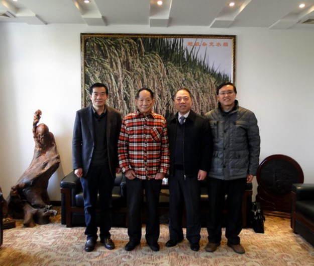 2014年2月21日,我与时任党(校)办主任刘遵海、宣传部干部吴彭年一道,专程赴长沙国家杂交水稻工程技术研究中心,拜访我校名誉教授袁隆平院士。我代表九江学院4万余名师生员工,向袁隆平院士表示问候,并向袁院士汇报了我校近年来教学、科研、服务地方经济社会发展及“山江湖”学科建设等取得的成绩。