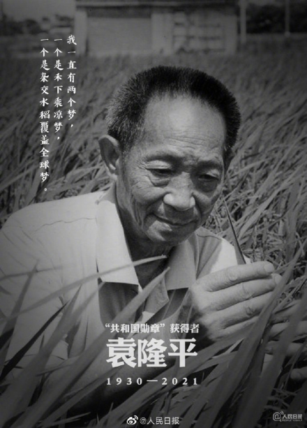 5月22日下午,噩耗传来:“共和国勋章”获得者、中国工程院院士、国家杂交水稻工程技术研究中心主任袁隆平,于2021年5月22日13时07分在长沙逝世,享年91岁。袁隆平院士于1930年9月7日出生,江西省九江市德安县人。他是中国杂交水稻育种专家,中国研究与发展杂交水稻的开创者,被誉为“世界杂交水稻之父”。