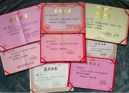 作为一位大学教师,徐芸内心充盈着对生命发展价值的期待、尊重和敬畏以及对教育人生、教育幸福的不懈追求。高校教学十八载,政治坚定、教学严谨、尊重学生、严于律己,坚持“不忘教育初心,耘德筑爱前行”的信念,坚持以德树人、以情育人、以智启人,全心全意服务于社会、学校、学生,始终践行文化传承的历史使命。2018年被评为九江学院首届“立德树人楷模”,多次获得九江学院“师德师风标兵”、“优秀党员”、“优秀教师”等荣誉称号。