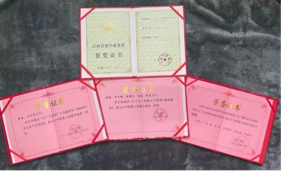 “青年如初春,如朝日,如百卉之萌动,如利刃之新发于硎,人生最可宝贵之时期也。青年之于社会,犹新鲜活泼细胞之在人身。”徐芸平时重视对教育教学经验的总结和提炼,在实践中不断地思考着、探索着全新的教育理念和培育方式样,对教材的选用也是精益求精。在学院领导们的大力支持下组建教材编写团队,徐芸用三年时间编写了《土木工程施工与管理》教材,于2016年与北京大学出版社合作“互联网+”教材建设项目,近年收获北京大学出版社“土木类专业教材特等奖”、“创新型优秀规划评比一等奖”、九江学院“教学成果奖一等奖”和江西省“教学成果奖二等奖”等荣誉。她耗时三年,2020年主编出版了《土木工程施工与管理》(第二版),实现了“安装APP,360°查看大量建筑模型”、“扫描二维码,翻阅相关知识点拓展资源”、“增加智慧建造内容,习题参考执业资格考试设置”等特色教材的目标。
