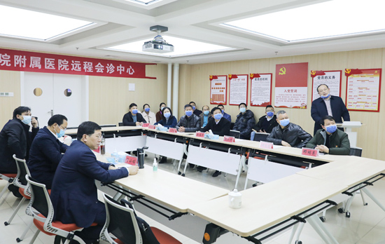 市政府副秘书长黄效兵、市卫健委党委书记宁小球等陪同,附属医院班子成员、相关部门负责人等参加会议。