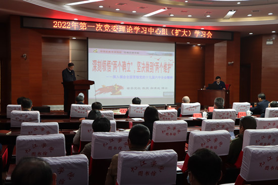 3月4日,校党委理论学习中心组举行2022年第1次(扩大)学习会,专题学习“两个确立”的决定性意义。党委书记赵伟主持会议并讲话,强调要持续深入学习贯彻党的十九届六中全会精神,深刻领会“两个确立”的决定性意义,不断提高政治判断力、政治领悟力、政治执行力。在校校领导、各二级单位党政负责人、各民主党派、知联会、留联会主要负责人参加了学习。