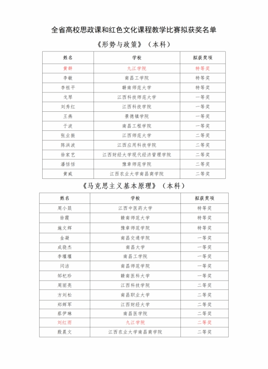 近日,九江学院参加教学比赛再传捷报,我校马克思主义学院教师在2024年度江西省高校思政课和红色文化课程教学比赛中取得了傲人成绩,黄群老师获《形势与政策》课程比赛特等奖第一名,刘红雨老师获《马克思主义基本原理》课程比赛二等奖,为九江学院赢得了荣誉。