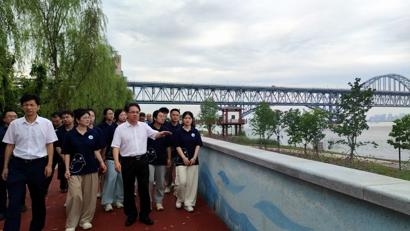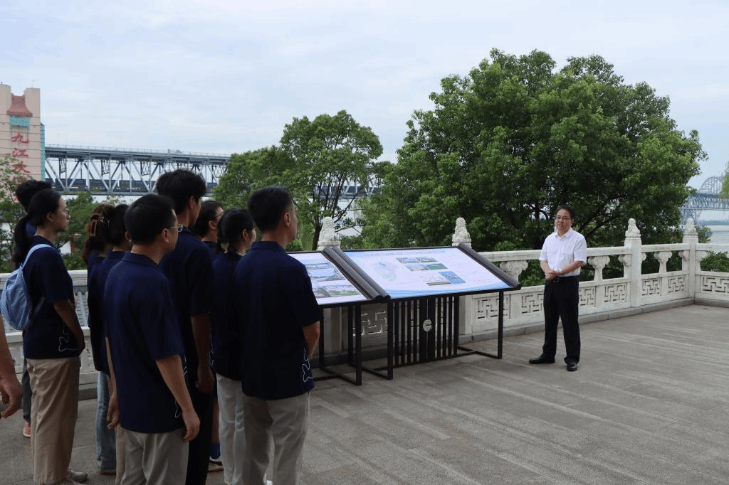 “同学们,此刻,我们所处的位置是长江国家文化公园(九江段)。去年10月10日下午,习近平总书记曾亲临此地考察调研,他深入了解了长江国家文化公园建设、长江岸线生态修复以及石化企业转型升级等情况。”7月16日,由旅游与地理学院14名师生组成的九江学院暑期大思政实践活动“爱江护豚”小分队,前往长江国家文化公园(九江段)开展“牢记嘱托强国有我,行走赣鄱感恩奋进”暑期大思政实践活动。九江学院党委书记李明斌特意来到现场,看望慰问大学生,并为师生们带来了一堂生动的专题党课。校党委委员、副校长查振华,宣传部部长刘平,校团委、马克思主义学院、旅游与地理学院负责人与“爱江护豚”小分队全体队员参加了本次活动。