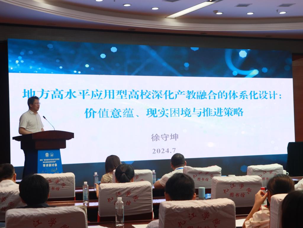 徐守坤作了题为《地方高水平应用型高校深化产教融合的体系化设计:价值意蕴、现实困境与推进策略》的报告。他强调,地方应用型高校的深化发展要以产教融合建设为抓手,把握机遇与挑战,从自身办学基础出发,充分发挥优势与特色,量体裁衣、摆脱束缚,找到一条与应用型高校本身相契合的发展道路。