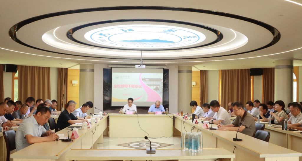 7月17日,学校在行政楼一号会议室召开全校领导干部会。校党委书记李明斌出席并讲话。校长陈小林就学校暑期和下学期期初有关工作进行部署。副校长王万山主持会议,校领导查振华、王殿元、李松志、鲁卫东、雷志强,党委委员刘遵海、刘平、杨杰出席会议。