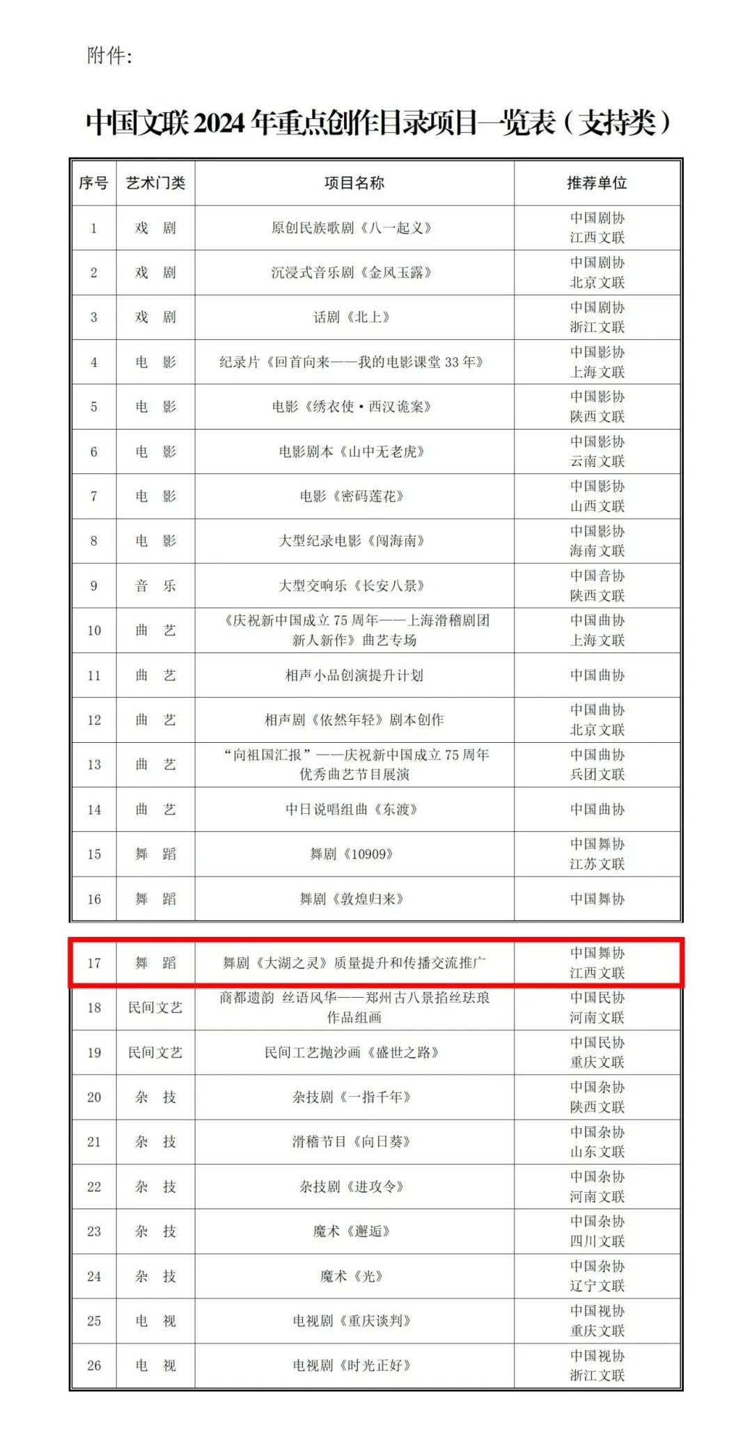 近日,中国文联公布了2024年重点创作目录项目,我校艺术学院与江西省文联共同打造的原创舞剧《大湖之灵》,作为江西省唯一和全国入选的三部舞剧作品之一成功入选。