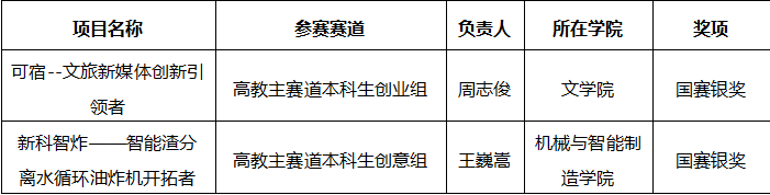 我校文学院《可宿--文旅新媒体创新引领者》和机械与智能制造学院《新科智炸——智能渣分离水循环油炸机开拓者》2个项目推荐进入国赛总决赛,并全部晋级现场赛,最终荣获国赛银奖,这是我校自2015年大赛启动以来,继2021年首次突破国赛铜奖后的又一次突破。这次充分了体现我校深化创新创业教育改革和探索在以创新创业人才培养为导向的应用型人才培养新模式取得的重要成果。