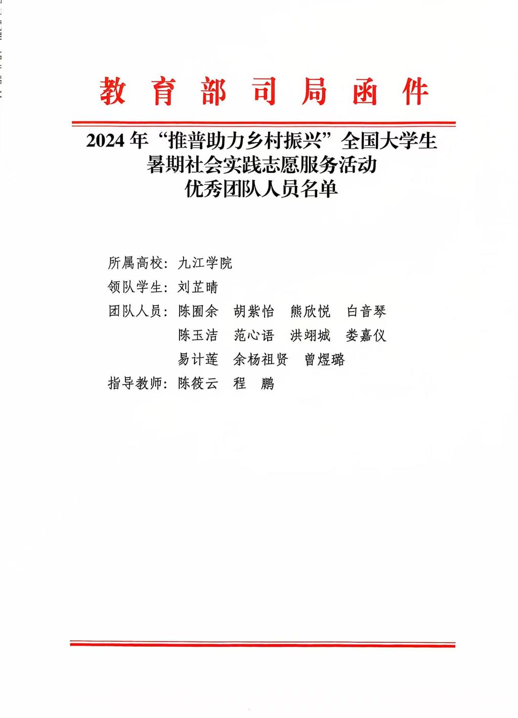 近日,教育部语言文字应用管理司与共青团中央青年发展部联合来函,表彰九江学院在2024年“推普助力乡村振兴”全国大学生暑期社会实践志愿服务活动中的突出表现。这一表彰充分肯定了九江学院扎实践行党的二十大精神,积极贯彻习近平总书记关于语言文字工作的重要指示批示精神和全国教育大会精神,利用国家语言文字推广基地助力乡村振兴的显著成效。