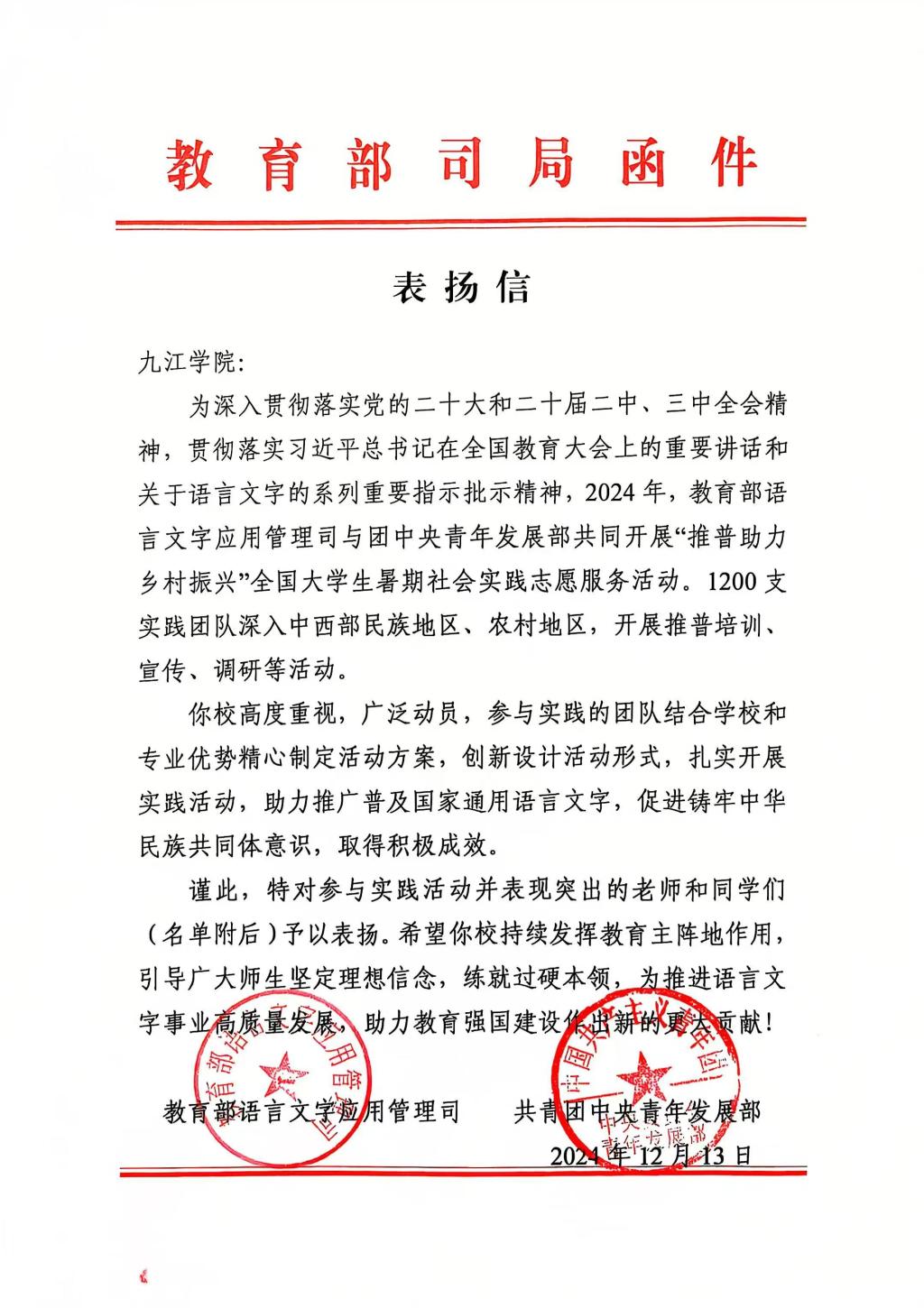 教育部和团中央在表扬信中对九江学院“文小青”团队的优异表现给予高度评价,称赞他们在助力乡村振兴中展现了九院学子的青春担当,并希望学校继续发挥教育主阵地作用,坚定师生理想信念,强化社会实践能力,为国家语言文字事业高质量发展和教育强国建设作出更大贡献。