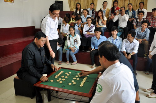 2月11日,柬埔寨王家研究院孔子学院芳华大楼多媒体放映室喜气洋洋,到处悬挂着喜气的灯笼,墙上张贴着春节风俗介绍,但最引人注目的是带置在地上的中国象棋大棋盘。孔子学院春节系列活动之中国象棋大赛庆新年在此隆重举行。柬埔寨国防部发展办公室副主任满强中将(MAM CHHEANG)和坦克军副总司令苏真格洒那中将(SOK CHANKRISSNA)作为特邀嘉宾出席了本次活动,孔子学院谢莫尼勒院长(CHEA MUNYRITH)、中方院长帅式毅、汉语教师志愿者及孔子学院学员约100人观摩了中国象棋大赛决赛。