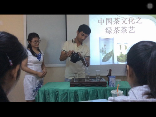 九江学院选派的汉语教师志愿者符素梅通过询问学生已学的“你家在哪儿?”“我家在江西九江。”等地点名词,借助PPT层层递进向同学们展示了“中国”“江西”“九江”“九江学院”“庐山”等。紧接着,符素梅讲到了庐山云雾茶,并向学生们展示了实物和图片。随后,又逐一介绍了庐山云雾茶和茶具。接下来,在悠扬清新脱俗的古筝版纯音乐《高山流水》的音乐背景下展示了中国绿茶茶艺。