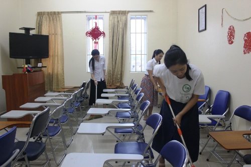 介绍之后,柬埔寨王家研究院孔子学院的师生们一起积极响应节日号召,在教学楼的教室进行打扫。