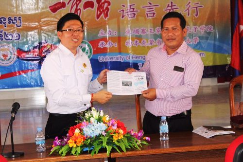 8月7日,柬埔寨王家研究院孔子学院院长谢莫尼勒阁下(H.E. CHEA Munyrith)专程赶赴柬埔寨特本克蒙省韩桑林大学(University of Heng Samrin Thbongkhmun),具体落实启动孔子学院特本克蒙省韩桑林大学汉语中心有关事宜。韩桑林大学校长品万那罗(H.E. PIN Vannaro)、副校长殷帮郎(YIN Bamnang)热情接待谢莫尼勒阁下一行并共同出席孔子学院特本克蒙省韩桑林大学汉语中心启动宣讲会,100余名特本克蒙省大、中学生参加了活动。