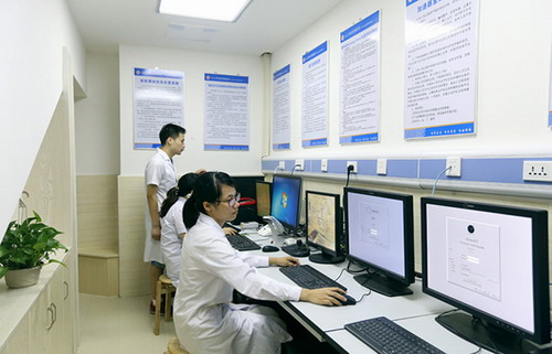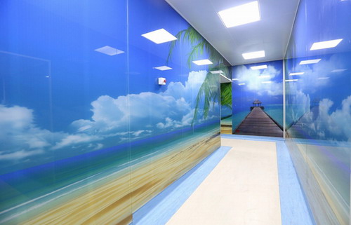 蓝天、碧海、沙滩……在治疗室,逼真美景融入到科技感极强的装修风格中,灯光设定科学而温馨,置身其中如临夏日海滨,类似于将患者仰视的天花板做成可亮光的蓝天白云图案设计,能极大消除其放射治疗时的恐惧感,尽显人文关怀。预约等候区明亮洁净,整排的皮质沙发,清爽而舒适。定位室、制模室、操作室紧挨机房入口,整个治疗区域位于西院住院楼的负一层,计划室、模具室、医生办公室等位于一楼,放疗患者可从病区电梯直达底层,分区布局科学合理。放疗科环境清新自然,令人印象深刻,放疗室的布局和装修独树一帜,秉承了临床医学院/附属医院在改善患者就医体验工作上一贯的高品质格局,充分体现了附属医院“以人为本、以病人为中心”的服务理念和宗旨。