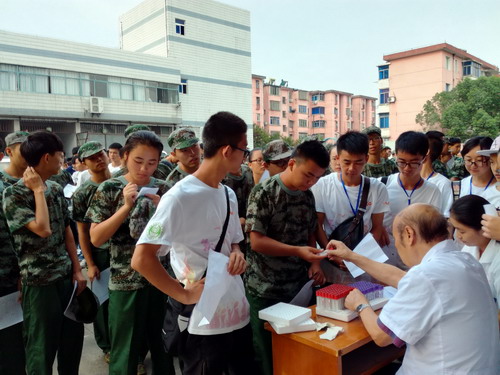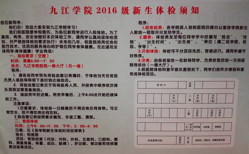 为了全面贯彻落实国家教育部颁发的《全国学校卫生工作条例》、《普通高等学校学生管理规定》,根据江西省《关于规范全省大中学校学生健康体检项目及费用标准的通知》(赣教体艺字【2011】32号)和《九江学院学生管理规定》的要求,在学校的统一安排和部署下,在党院办、学生处、团委、后勤管理处、各校区和各二级学院等单位的大力支持下,我校2016年级学生入学体检复查工作于2016年9月8日早上6:00拉开了序幕。