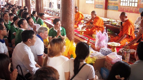 孔院教师的到来受到佛寺副住持索昆提(Venerable SOK KUNTHEA, Vice Master of the Pagoda)的欢迎,夏院长代表全体教师表达了谢意和祝福。他说,孔子学院的建立是应世界各国汉语学习者的需求而搭建的汉语学习平台,目的在于为汉语学习者提供汉语教学服务,同时加强中外文化交流。他表示,柬埔寨王家研究院孔子学院成立以来得到了柬埔寨政府和社会各界的大力支持,在柬工作的汉语教师一定继续努力,以报答柬埔寨人民的厚爱,为汉语教学和中柬友好做出贡献。寺庙住持诵经祈福,为教师们洒圣水,抛洒茉莉花,寓意平安健康、和乐美满,并为中柬人民祈福。