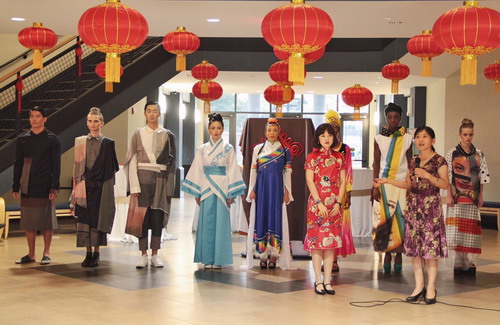 接下来,伴随着优美动听的音乐,身着中国民族服饰的美国学生模特们缓缓走来,中方院长向来宾们逐一介绍了独具中国特色的各类服饰。从含蓄典雅的汉服到长袖宽腰的藏服,从大方美观的旗袍到多彩绚丽的维族服装,每一套服饰都如同一张文化名片,蕴涵着中华传统文化悠久的历史,更彰显出世界文化交融的多样性。