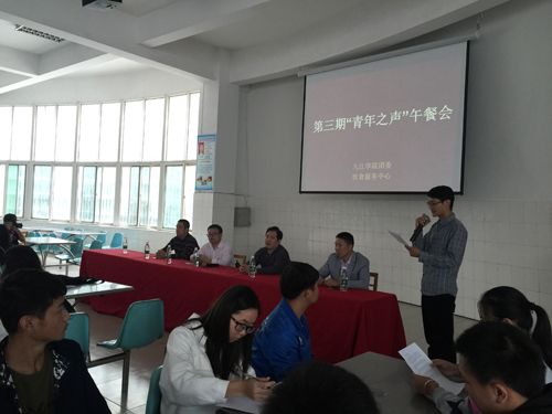 10月16日上午,校团委和饮食服务中心在学生三食堂组织九江学院第三期青年之声午餐会。校团委书记闫来英、饮食服务中心主任蔡飞、三食堂经理王焱平、配送中心经理柳欣江共同出席了本次活动,校学生会学生代表李鑫主持了这次午餐会。