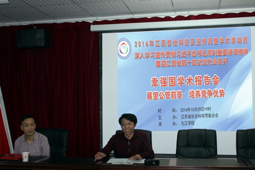 10月29日晚,根据江西省2016年社科普及宣传周暨学术活动周主要学术报告安排,政法学院邀请西南财大幸强国教授来校讲学。此次活动由江西省委宣传部和江西省社会科学界联合会联合举办、九江学院承办,九江学院政法学院与科研处负责具体实施。政法学院院长詹建志与师生共80余人到场聆听,现场座无虚席,报告会由詹建志院长主持。