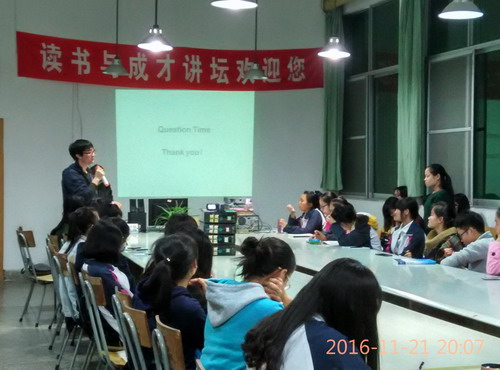 杨万水老师首先回顾了他的读书历程,他从小学课本上的《小马过河》例子谈到既要多读书,更要敢于实践;谈到读研究生时最喜欢泡学校的图书馆,因为这里有读书的最好氛围,同时这里又有无数的老师——书籍;谈到求学时老师布置的作业很多在教材里根本找不到答案,要寻求答案只能到图书馆……,他用自己的历程告诉我们,书是我们最好的老师,在书中我们可以找到自己的兴趣然后去培养,去继承,去创新。杨老师提出了“继承--批判--更新”的思想,这些都是靠自己领悟的,批判性思维地学习,发现并提出有价值的问题,之后才有创新,而创新则是成功,继而就是一个成长的过程。他还说到每次他进图书馆都是抱着愉悦的心情去的,因为在这种文化气息下,能够滋润我们的心灵,这无疑是一个好的开始。