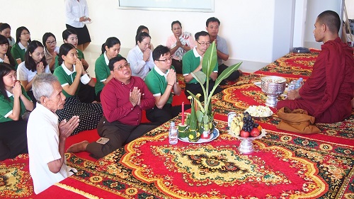 上午8点半,祈福仪式开始,僧侣用郎朗的诵经声送出美好的祝福,随手挥洒的花瓣和圣水一同祝福每一个孔院人。台下众人双手合十,端坐于地,虔诚祈祷。祝福孔子学院越办越好,祝福中柬友谊长盛不衰。