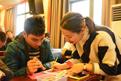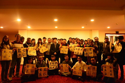随后,来自艺术学院的王祖刚老师给大家上了一课精彩的书法课。王老师先是给大家介绍了一下中国书法的演变和发展,再示范了正确的握笔姿势之后,王老师开始教授大家学习写“永”字。通过对“永”字八法的练习,大家初步了解了书法的握笔和书写方式,并进一步学习书写“中国”、“文以载道”等汉字。来自柬埔寨暹粒省外事及投资办公室主任欧文提说:“很高兴我有学习中国书法的机会,今天学会了好几个字,从中感悟到中国传统书法文化的深厚内涵。希望以后能够学会写更多的中国汉字。”课程结束后,大家纷纷展示自己的优秀作品,和老师合影留念。