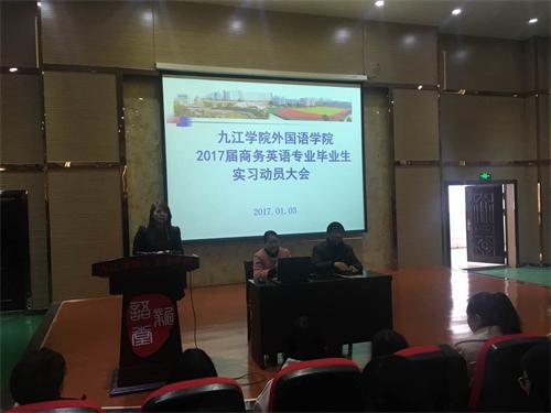 1月3日下午,外国语学院在香远楼三楼视听室召开了2017届商务英语毕业生实习动员大会。外国语学院副院长柴克清,商务英语教研室主任章志红及相关实习老师参加了大会。