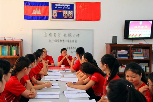 吴哥高中孔子课堂负责人刘振老师汇报了吴哥高中的工作情况,谢莫尼勒院长和夏修龙院长对吴哥高中的工作给予了充分肯定。谢院长说,孔子课堂的办公环境要逐步规范化、硬件设施要进一步改善,为更好、更完备的教学打基础。此外,在教学上,要多向柬埔寨学生教授中国的文化知识,尤其是有关中国现当代高科技的、实用性的文化知识。夏修龙院长强调了安全工作的重要性,希望老师们在工作和生活中互帮互助,和睦相处,保持积极向上的工作热情。对2017年的工作,夏院长提出了意见和建议。新年之际,谢院长和夏院长祝各位老师新年快乐,万事如意。