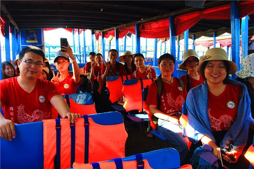 坐在具有柬埔寨特色的游船上,教师们兴奋异常,感受着自然之美,畅谈着心灵感受。吴哥高中孔子课堂负责人刘振老师对大家说,作为汉语教师,我们是中国的符号和名片,我们每个人都是一面流动的国旗。同时,我们也是“一带一路”战略中“民心相通”的重要纽带。希望通过此次活动,能使大家更深刻的认识和了解柬埔寨的人文地理和风土民情,对今后的中柬文化交流有所帮助。