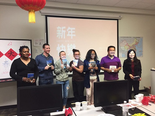 当地时间1月26日,萨凡纳州立大学孔子学院的学生们听着喜庆的中文歌,吃着美味的中国点心,欢聚在弥漫着浓浓中国年味的孔院教室,共同庆祝2017年中国春节。中方院长罗其娟向大家介绍了春节的有关习俗,钟佳艺老师带领大家一同用中文演唱了歌曲《新年好》,正式拉开了春节联欢会的帷幕。随后,孔子学院汉语教师带领孔院学生们用各色彩纸剪出了漂亮的“春”字,大家一起迎春接福。在游戏互动环节,大家都按耐不住兴奋激动的心情,各个摩拳擦掌、跃跃欲试,纷纷加入到每项比拼当中。筷子夹彩豆、踢毽子、掂乒乓球等项目都深得外国学生们的喜爱,每位参与游戏的学生都得到了一份独具中国特色的新年礼物。到场学生表示,此次新春联欢会不仅有好歌美食相伴,还进一步了解了中国传统文化和春节年俗,感受到了来自孔院大家庭的团圆年味。