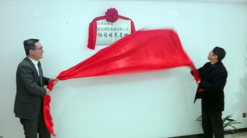 为了落实地方性卓越法律人才的培养目标,实现地方高校社会服务的功能和价值,促进和深化与律师事务所在人才培养、理论培训、实务研讨等方面的合作,3月1日上午,政法学院与江西柴桑律师事务所联合举行了合作共建签约仪式暨卓越法律人才协同培养基地揭牌仪式。政法学院詹建志院长、宛锦春副院长、曹钟安副院长,实验室主任钟文红、副主任陈昊;柴桑律师事务所主任刘晖,副主任简武、周立斌,高级合伙人田玮琅、张立陶、沈峰、潘敏等参加了仪式。
