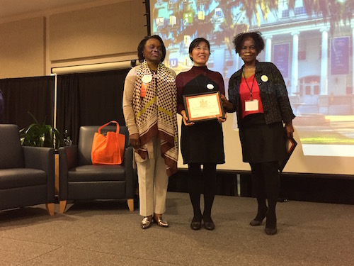 萨凡纳州立大学孔子学院外方院长布拉德在讲座后致闭幕辞,授予赵梅教授荣誉证书,并感谢大家参加此次女性领导力会议,呼吁女性关注自身健康,保持良好的生活习惯。最后,她向在场来宾介绍了孔子学院,并邀请各位参与到孔子学院组织的各项活动中来,了解中国文化和学习汉语。