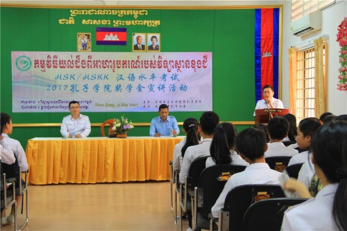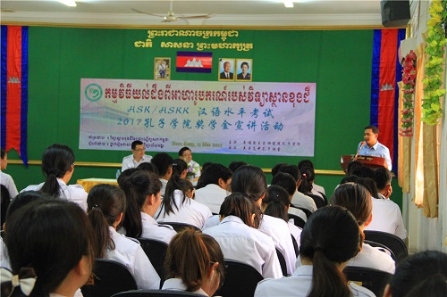 3月11日,汉语水平考试HSK/HSKK及孔子学院奖学金宣讲活动在吴哥高中行政楼会议大厅举行。柬埔寨王家研究院孔子学院谢莫尼勒(H.E.Chea Munyrith)院长、吴哥高中校长任诺特(RIN Lot)先生、孔子学院暹粒吴哥高中孔子课堂全体汉语教师及学生100 余人参加了此次活动。