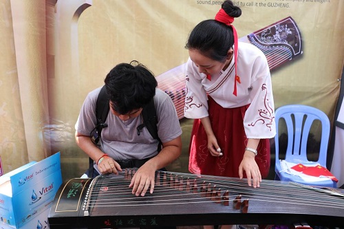 本次活动分为主展区和美食、传统游戏、语言文字、纪录片和文艺演出等展区,内容丰富,体现了各国多元文化。中国馆主展区热闹非凡, “我想试穿汉服”“我想学写毛笔字”“我想喝中国茶”……一连串的欢声笑语萦绕着中国馆。想要试穿中国古典服装的人排起了长队,各国游客们穿着中国古典汉服、戏服、清宫装拍照,喜悦之情洋溢在微笑的面庞。书法、茶艺、古筝前面也已挤满想要学习尝试的热情游客。柬埔寨教育、青年、体育部国务秘书约克诺伊等领导兴致勃勃地来到中国馆,他挥笔写下“中柬友谊万岁”,赢得现场热烈掌声。