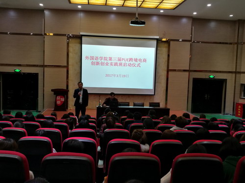 继2016年外国语学院PUE平台与义乌城商会合作取得重大成果,今年经过紧张的前期筹备,继续和义乌诚商会合作,3月19日晚,外国语学院在香远楼3楼报告厅举行了第三届PUE跨境电商创新创业实践班启动仪式。启动仪式由教学科研管理科科长王伟主持。出席开班启动仪式的有外国语学院党委副书记彭晓、教学科研管理科科长王伟、学生科科长吴章义、专业教研室主任,教师代表以及外国语学院商务英语和日语专业学员。