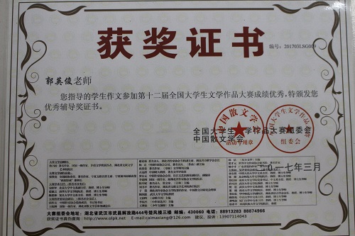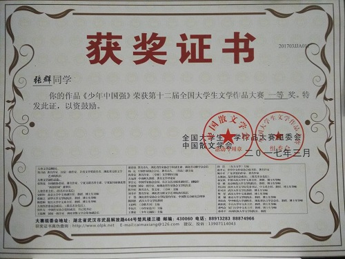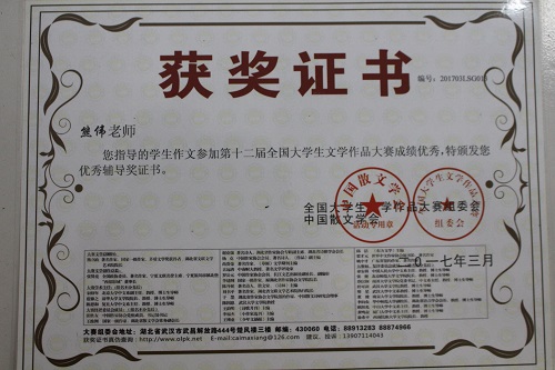 在近日举行的第十二届全国大学生文学作品大赛中,我校文传学院积极组织学生参赛,上报了21份作品,经大赛阅卷老师初评、值班评委复评、作家团终审评定,有17篇作品喜获佳绩。