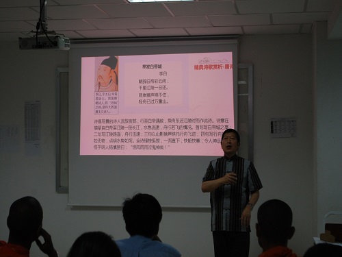 古力子先生以《诗经》中的经典作品鉴赏为切入点,就中国诗歌的发展及不同时期的代表人物和名篇做了详细的讲解。他说:“诗歌就如同夜空里闪烁的明星,简单的诗词却蕴含着深刻的哲理,在学习诗歌中可以感受到中华文化的精华”。古力子先生还亲自为同学们动情地朗诵经典诗歌《静夜思》、《咏鹅》、《早发白帝城》、《登鹳雀楼》等作品,学生们在古力子先生悠扬深情的朗诵声中,感受到了中国诗歌的音律美和声韵美,体会到了古力子先生内心深处对诗歌的真挚热爱。古力子先生指出:学习诗歌可以提高大家的汉语水平,可以获得更多人生感悟,用诗歌表达心境、激发斗志、鼓励前行。他希望有更多的柬埔寨学生能理解中国诗歌,从而在诗歌中体会中华文化的精深。在古力子先生的带领下,全体师生一起朗诵苏轼的《念奴娇·赤壁怀古》,激昂动情的朗读将整场讲座氛围推向了高潮,使大家沉浸在诗歌的氛围中,汲取精神的营养。