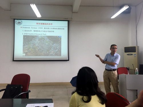 松涛博士在美国斯坦福大学进行了为期一年的访学研究。会上,许博士就斯坦福崛起的思考、学校(院)文化、学院与学科专业设置、课程设置、对师生的认识、课堂教学特征、学术及交流特征等方面展开了汇报。