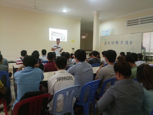 为了激发学生的学习积极性,使学生进一步了解现代中国,7月3日下午,柬埔寨王家研究院孔子学院西哈努克省高级中学汉语中心在西哈努克省高级中学汉语中心举办留学中国经验交流会。此次活动由从中国九江学院留学归来的裴永平(Phephat Pheng)同学主讲,汉语中心负责人李智老师、西哈努克省教育厅林江老师(Lim Kheang)及汉语中心师生共50余人参加。