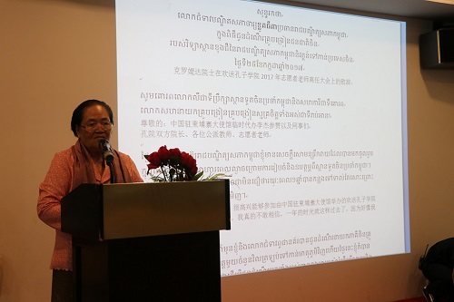 2017年7月24-25日,柬埔寨王家研究院孔子学院2016-2017年度外派教师和志愿者教师欢送会分别在暹粒省和金边市举行。中国驻柬埔寨大使馆参赞李杰、柬埔寨王家研究院院长克洛媞达(KHLOT Thyda)、副院长宋春文(SUM Chhumbun)、暹粒省教育厅副厅长洪万钠(HONG Upbolvanna)、柬埔寨孔子学院院长谢莫尼勒(CHEA Munyrith)、中方院长夏修龙以及全体汉语教师参加了欢送会。