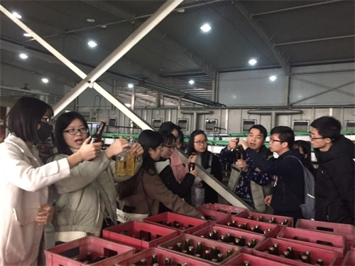 随后,将同学们分为两组,在公司技术员的带领下,分别走进了啤酒、白酒生产技术领域,参观学习了啤酒、白酒酿造车间,灌装和包装过程以及啤酒、白酒检测工艺。使同学们详细了解了啤酒、白酒从原料到产品整个工序流程。