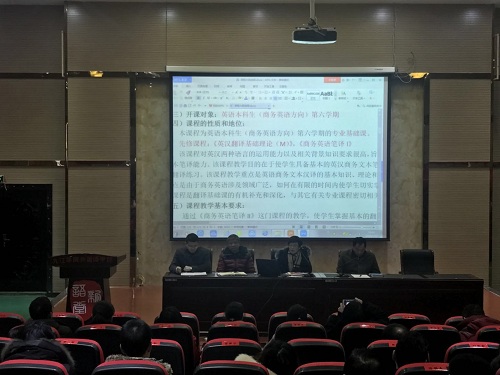 韩琨以PPT的形式向大家讲解了校内自评过程中专家反馈的关于自评报告、毕业论文、试卷及试卷分析、教学大纲、实验实习报告、教学档案留存等问题,并以商务英语专业中《英汉翻译基础理论(M)》为例,详细剖析了教学大纲和课程大纲的编写和完善。她希望大家务必严格按照整改方案和进度表的要求,顺利完成审核评估工作。