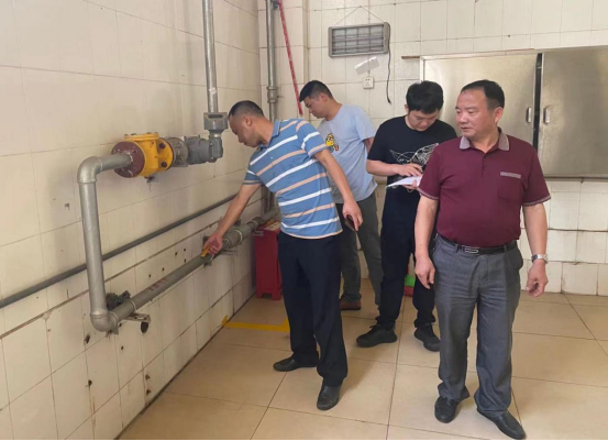 检查组先后来到中心仓库、净菜配送中心、学生一食堂、学生三食堂、学生四食堂、学生五食堂、浔东食堂食堂等处,检查人员首先对各食堂天然气安全使用、专人管理、台账登记、应急预案等相关制度建立情况进行了检查,并对燃气灶台、管道、阀门及不锈钢波纹管等燃气设备设施定期维保情况进行仔细检查。